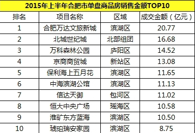 2015年7月2日深夜,《2015年合肥單盤商品房成交金額排行榜》權(quán)威發(fā)布,上半年合肥樓市雖然有所下滑,整體呈現(xiàn)“價(jià)升量跌”的態(tài)勢(shì),但單盤商品房成交金額仍不乏亮點(diǎn),其中最引人注目的當(dāng)屬合肥萬(wàn)達(dá)文化旅游城,以20.77億元的絕對(duì)優(yōu)勢(shì)榮登榜首;而北城世紀(jì)城因體量巨大而以單盤商品房成交金額16.68億元位列第二;廬陽(yáng)區(qū)萬(wàn)科森林公園以高人氣高銷量獲單盤成交金額14.52億元排名第三。