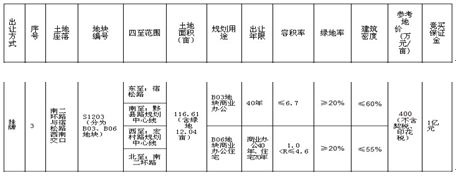 據(jù)合肥招標(biāo)投標(biāo)中心網(wǎng)公告顯示,包河區(qū)S1203號宗地座落于南二環(huán)路與宿松路西南交口,四至范圍:東至宿松路、南至黟縣路規(guī)劃中心線、西至宏村路規(guī)劃中心線、北至南二環(huán)路,出讓面積達(dá)116.61畝。分為B03、B06兩個地塊,其中,B03地塊規(guī)劃用于商業(yè)辦公,出讓40年、容積率≤6.7;B06地塊規(guī)劃用于商業(yè)辦公住宅,商業(yè)辦公出讓40年,住宅出讓70年,容積率1.0 &l;R&l; SPAN&g;≤4.6。參考地價400萬/畝,繳納競買保證金1億元。