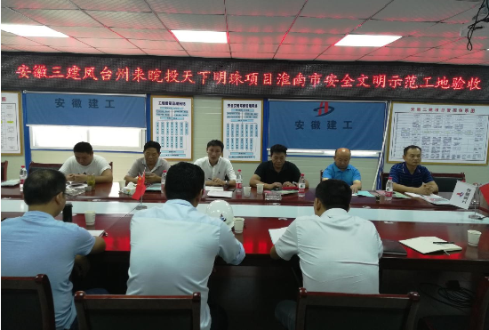 會議首先由安徽三建項目經(jīng)理對鳳臺州來皖投天下明珠項目安全文明施工開展情況進行了匯報。隨后,專家組成員對大型設(shè)備設(shè)施、模板腳手架支撐、施工用電等方面分組進行了嚴(yán)格檢查,實地核查了整個項目現(xiàn)場施工情況,并仔細(xì)查閱了項目部安全管理資料。驗收評審會上,專家組對天下明珠項目部在安全文明生產(chǎn)、揚塵治理工作方面所做出的努力給予了充分肯定,對項目下一步創(chuàng)建安徽省建筑施工安全標(biāo)準(zhǔn)化示范工地提出了建設(shè)性意見。