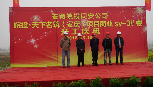 2016年3月18日上午,安慶天下名筑項目商業(yè)3#樓舉行項目開工典禮,現(xiàn)場彩旗飄揚、鞭炮齊鳴,皖投同安公司、安徽南巺監(jiān)理公司、安徽三建工程公司及合作單位相關人員參加開工儀式。