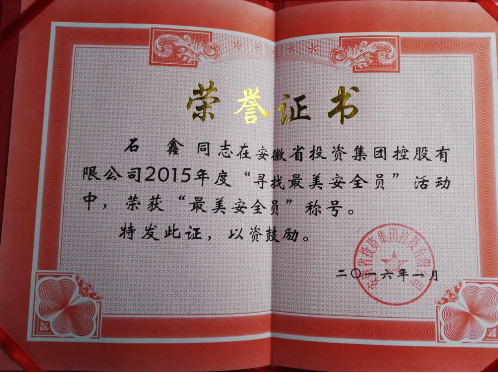 近日,皖投同安公司副總經(jīng)理石鑫榮獲集團(tuán)公司2015年度“最美安全員”稱號(hào)。