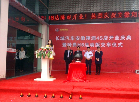 2014年5月18日,長城汽車安徽翔潤4S店開業(yè)慶典暨哈弗H6運動版交車儀式在蚌埠(皖北)國際汽車城盛大舉行。4S店董事長兼總經(jīng)理陳文鋼一行出席慶典儀式。