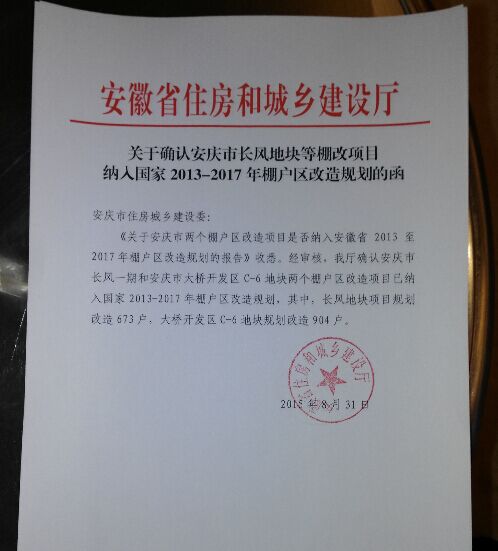2015年8月31日,皖投同安公司兩個在建棚改項目安慶市長風地塊和大橋開發(fā)區(qū)C-6地塊獲安徽省住房和城鄉(xiāng)建設廳正式確認,納入國家2013-2017年棚戶區(qū)改造規(guī)劃。