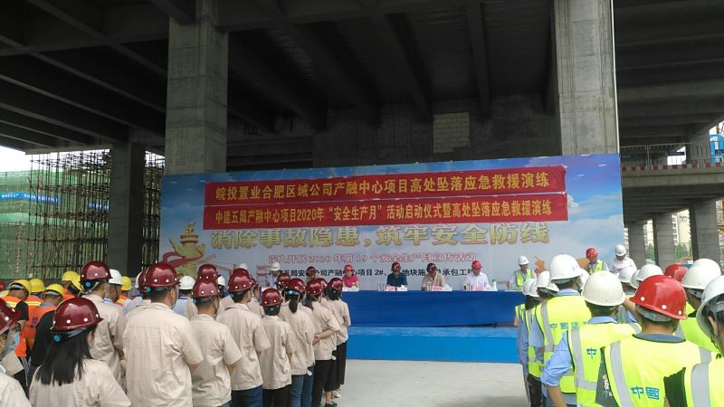 為認(rèn)真落實(shí)合肥區(qū)域公司2020年“安全生產(chǎn)月”活動(dòng)計(jì)劃,2020年6月12日上午,合肥區(qū)域公司在產(chǎn)融中心商辦項(xiàng)目現(xiàn)場(chǎng)組織開展高處墜落應(yīng)急救援演練活動(dòng)。經(jīng)開區(qū)質(zhì)監(jiān)站站長(zhǎng)孫麗娟、皖投置業(yè)總經(jīng)理助理劉賢明、合肥區(qū)域公司總經(jīng)理石鑫出席活動(dòng),合肥區(qū)域公司各部門、各項(xiàng)目部(監(jiān)理部、總包單位)、中建五局項(xiàng)目部、科信監(jiān)理、分包單位共計(jì)100多人參加應(yīng)急處置演練活動(dòng)。
