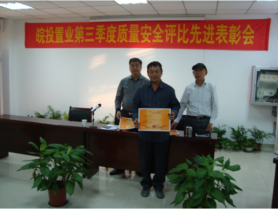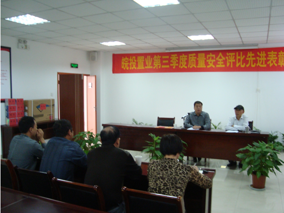 2012年10月15日下午,項(xiàng)目管理總監(jiān)丁昌華在公司會(huì)議一室主持召開(kāi)了2012年三季度質(zhì)量安全評(píng)比表彰會(huì),工程管理部,皖投置業(yè)各項(xiàng)目部、施工單位、監(jiān)理單位的項(xiàng)目負(fù)責(zé)人及相關(guān)人員參加。